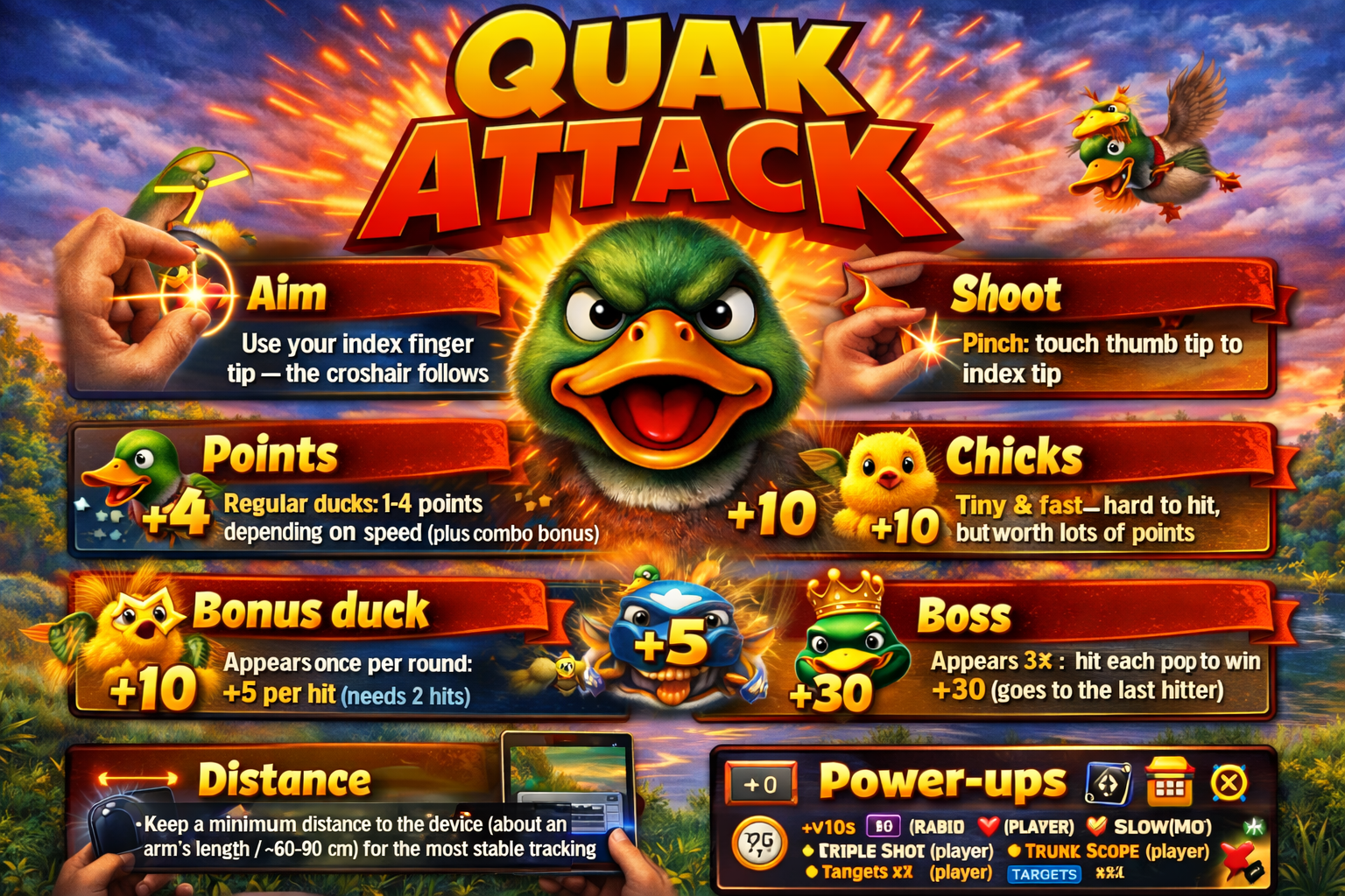 | Tags | 2D, actiongame, browsergame, duck, handtracking, Indie, Short, Singleplayer, webcam |